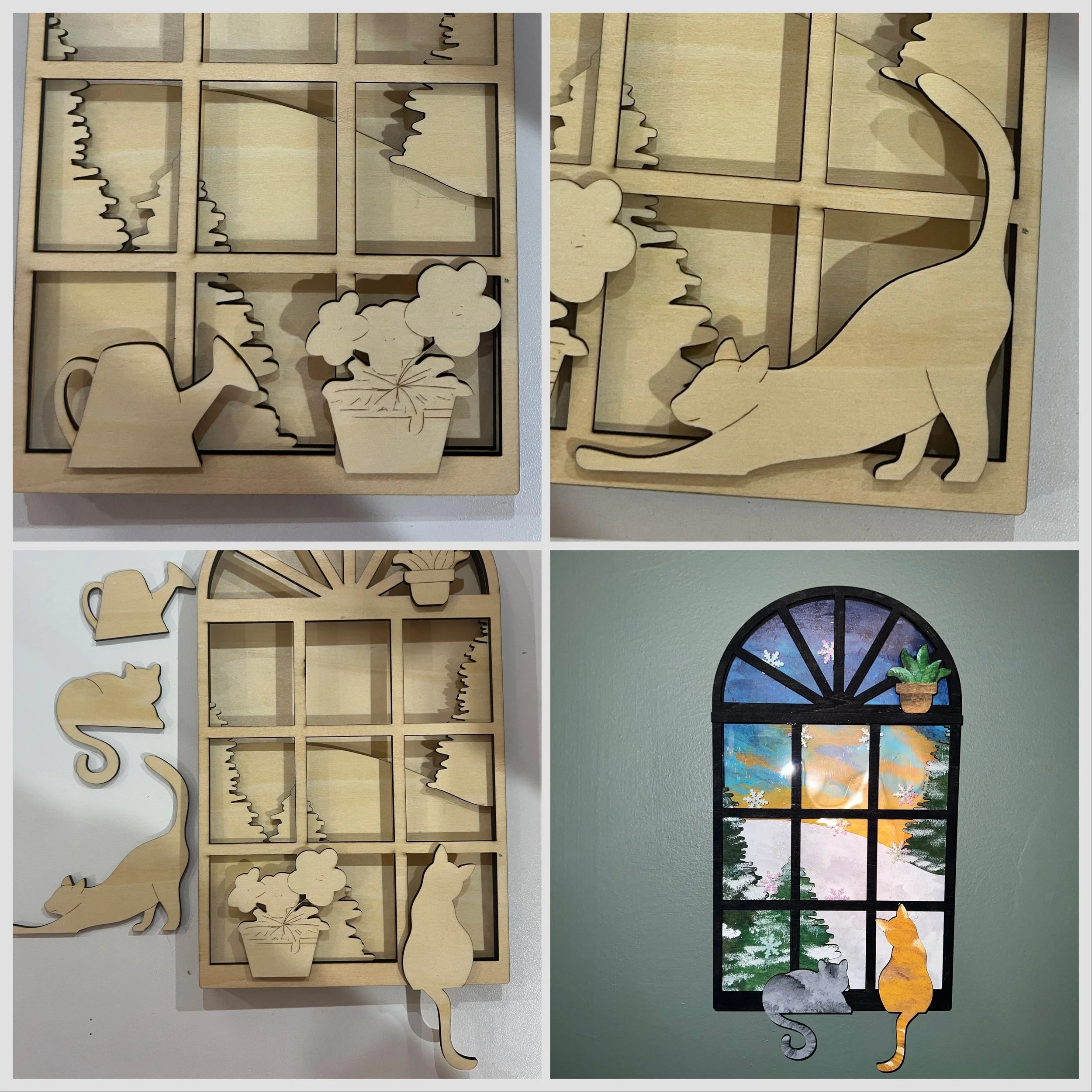 Join us to create a charming layered window scene using four pieces, including a clear plastic window layer for added depth. Choose from six included plants and cats to build your own custom windowsill, and paint the background in any style or season you love.